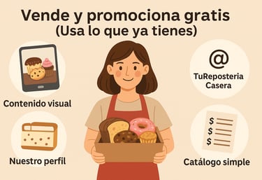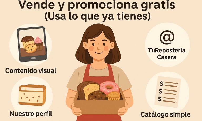 Contenido visual: Fotos apetecibles con tu teléfono (luz natural, fondo limpio) en Instagram o grupos de WhatsApp locales. Crea un perfil dedicado: @TuReposteriaCasera, con bio clara ("Dulces caseros con amor – pedidos locales").